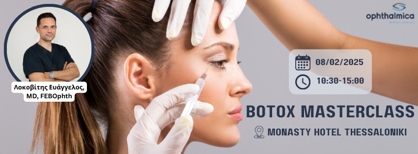 Το Ινστιτούτο Οφθαλμολογίας & Μικροχειρουργικής Ophthalmica έχοντας ανακοινώσει την εκκίνηση μιας σειράς από Advisory Round Tables επάνω στις αισθητικές παρεμβάσεις, διεξάγει το τρίτο Botox Masterclass το Σάββατο 08 Φεβρουαρίου 2025 και ώρα έναρξης 10:30, στο Monasty Hotel Thessaloniki, αίθουσα “Opus 1”.