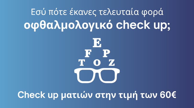 Στο πλαίσιο του προγράμματος Εταιρικής Κοινωνικής Ευθύνης, σας δίνουμε τη δυνατότητα προληπτικού οφθαλμολογικού ελέγχου με ειδική τιμή 60€.